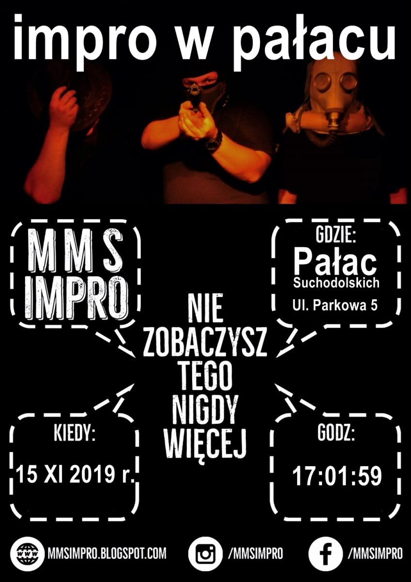 W piątkowy wieczór, 15 listopada 2019 r. gościliśmy w Pałacu Suchodolskich grupę improwizacji teatralnej MMS impro z Rudy-Huty w składzie: Marcin Woszczewski, Macin Nawrocki, Szymon Woszczewski, Paulina Mierzicka.
