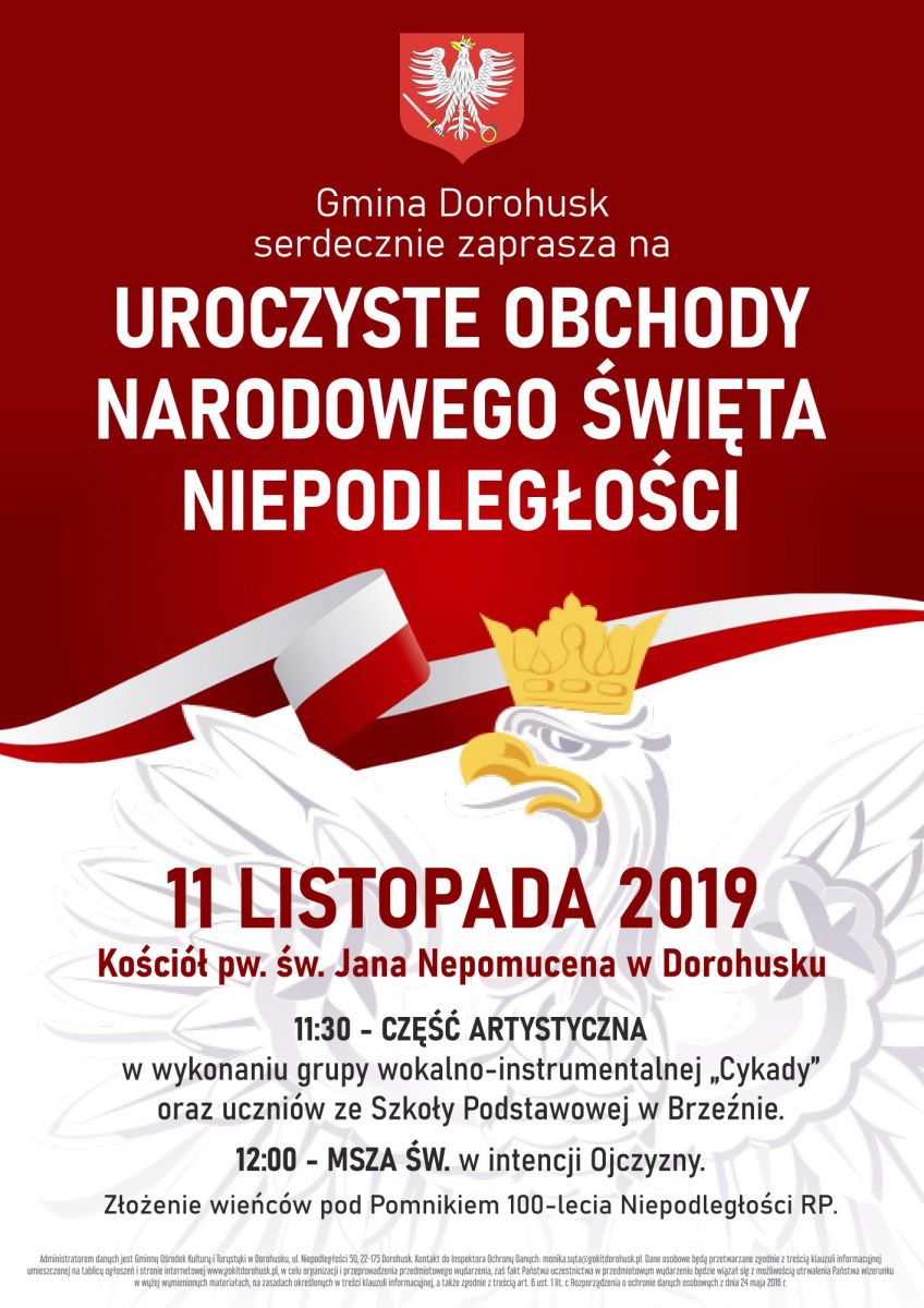 W poniedziałek, 11 listopada 2019 r. w kościele parafialnym pw. św. Jana Nepomucena w Dorohusku odbyły się gminne uroczystości "Narodowego Święta Niepodległości".