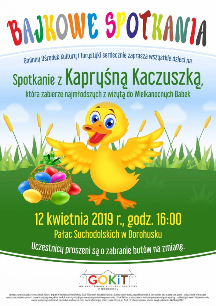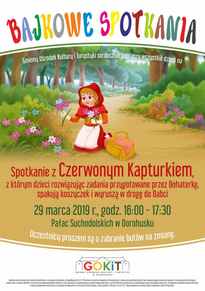 29 marca 2019 r. w Pałacu Suchodolskich w Dorohusku odbyło się kolejne z „Bajkowych Spotkań”. Tym razem dzieci miały okazję poznać historię Czerwonego Kapturka oraz wziąć udział w przygotowanych przez Bohaterkę zabawach.