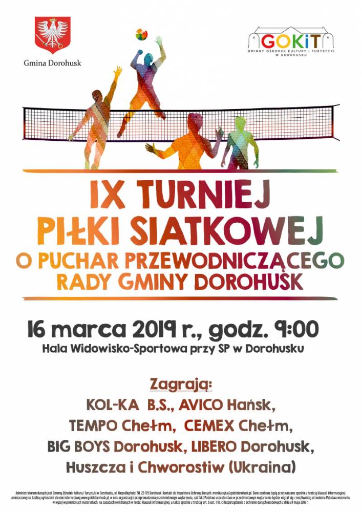 W sobotę, 17 marca 2019 r. z udziałem siedmiu drużyn, w Hali Widowiskowo-Sportowej Szkoły Podstawowej w Dorohusku odbył się IX Turniej Piłki Siatkowej Mężczyzn o Puchar Przewodniczącego Rady Gminy Dorohusk.