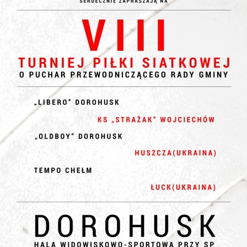 Serdecznie zapraszamy na VIII Turniej Piłki Siatkowej o Puchar Przewodniczącego Rady Gminy Dorohusk w dniu 17 marca 2018 r. Start imprezy o godz. 10:00 w hali widowiskowo-sportowej przy Szkole Podstawowej w Dorohusku.