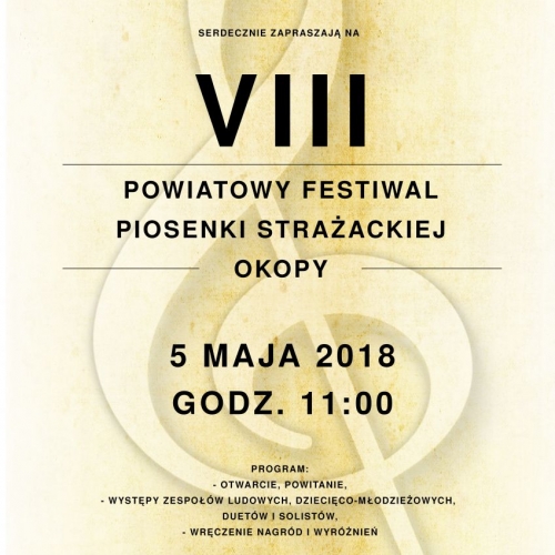 Serdecznie zapraszamy na VIII Powiatowy Festiwal Piosenki Strażackiej, który odbędzie się 5 maja 2018 r. w remizo – świetlicy OSP w Okopach. Podczas wydarzenia występy zespołów ludowych, dziecięco-młodzieżowych, duetów oraz solistów. Rozpoczynamy o godzinie 11:00