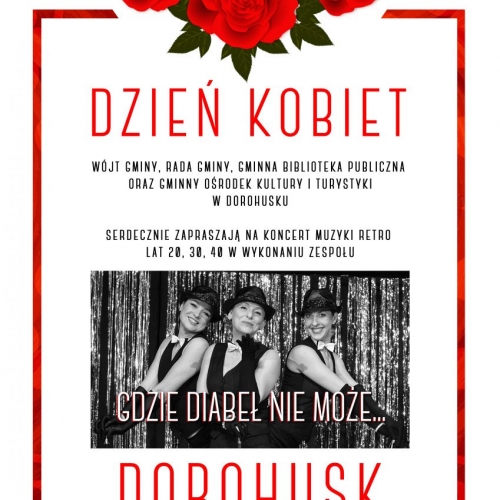 Wójt Gminy, Rada Gminy, Gminna Biblioteka Publiczna oraz Gminny Ośrodek Kultury i Turystyki w Dorohusku serdecznie zapraszają na koncert muzyki retro z okazji Dnia Kobiet w wykonaniu zespołu "Gdzie Diabeł Nie Może..." Uroczystość odbędzie się 11 marca 2018 w hali widowiskowo-sportowej przy Szkole Podstawowej im. kpt. Kazimierza Filipowicza „Korda” w Dorohusku o godz. 14:30.