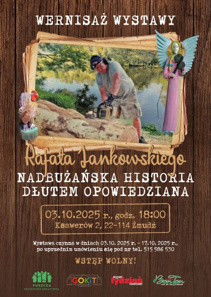 W piątek, 3 października br., w Puszczy Przestrzeni Kreatywnej odbył się wernisaż wystawy Rafała Jankowskiego pt. „Nadbużańska historia dłutem malowana”. Autor ekspozycji – rzeźbiarz ze Świerż, od lat związany z kulturą nadbużańską – zaprezentował swoje prace licznie zgromadzonym gościom.