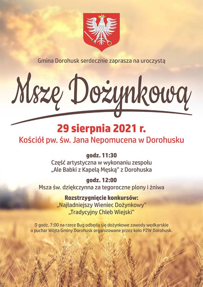 29 sierpnia 2021 r. o godz. 12:00 w kościele pw. św. Jana Nepomucena w Dorohusku odbyła się uroczysta Msza św. dziękczynna za tegoroczne zbiory i żniwa.
