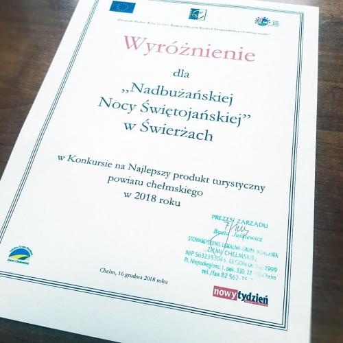 Nadbużańska Noc Świętojańska w Świerżach otrzymała wyróżnienie w konkursie na „Najlepszy produkt turystyczny” Powiatu Chełmskiego w 2018 roku.