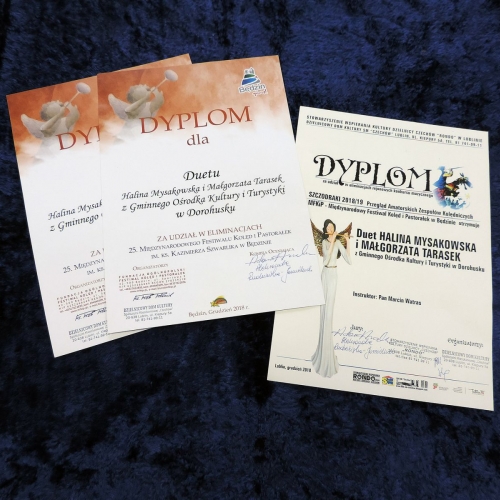 Niezmiernie miło nam poinformować, że duet wokalny - Halina Mysakowska i Małgorzata Tarasek reprezentujący Gminny Ośrodek Kultury i Turystyki w Dorohusku zdobywając nagrodę główną w eliminacjach Konkursu Muzycznego Szczodraki 2018 w Lublinie, dnia 17 grudnia 2018 r. zakwalifikował się do Międzynarodowego Festiwalu Kolęd i Pastorałek im. ks. Kazimierza Szwarlika, który odbędzie się w dniach 11-13 stycznia 2019 r. w Będzinie.