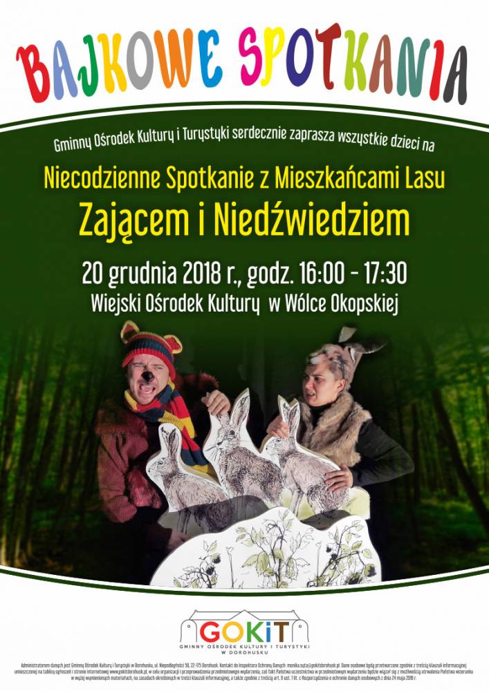20 grudnia 2018 r. w Wiejskim Ośrodku Kultury w Wólce Okopskiej odbyło się kolejne z cyklu "Bajkowych Spotkań" - Spotkanie z mieszkańcami lasu - Zającem i Niedźwiedziem.