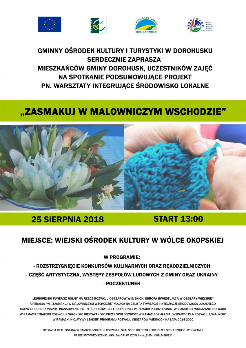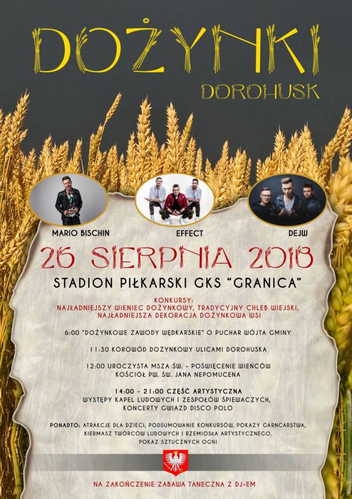 Zapraszamy na Dożynki Gminy Dorohusk, które odbędą się 26 sierpnia 2018 na stadionie piłkarskim GKS "Granica w Dorohusku.