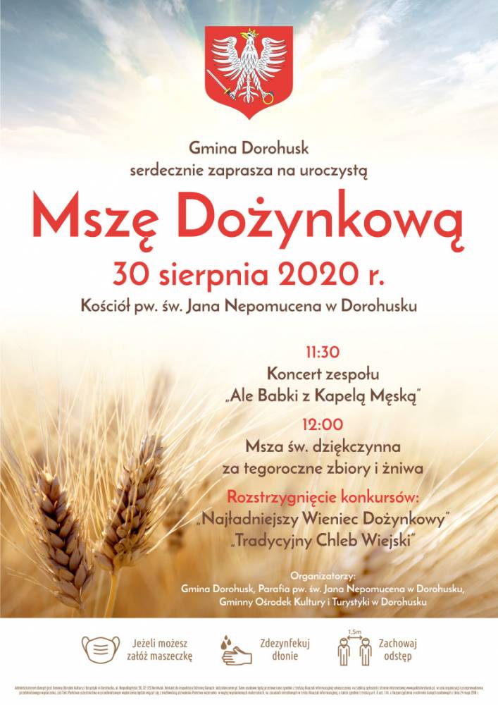 30 sierpnia 2020 r. o godz. 12:00 w kościele pw. św. Jana Nepomucena w Dorohusku odbyła się uroczysta Msza Dożynkowa dziękczynna za tegoroczne zbiory i żniwa, którą odprawił ks. dr Witold Gąciarz.