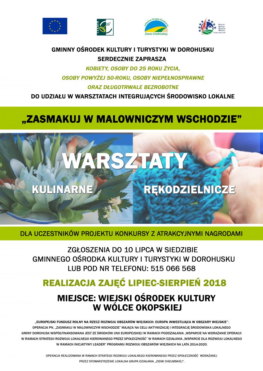 Gminny Ośrodek Kultury i Turystyki w Dorohusku serdecznie zaprasza do udziału w warsztatach integrujących środowisko lokalne pn. "Zasmakuj w malowniczym wschodzie"