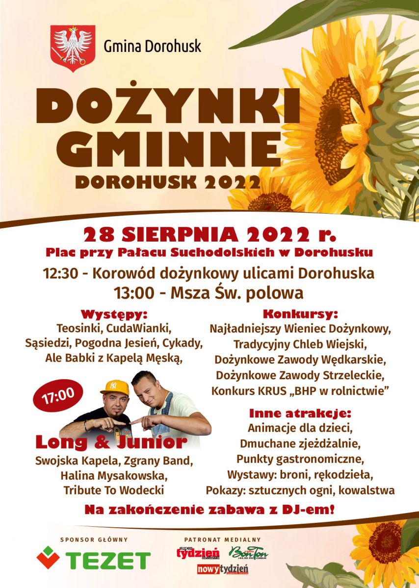 W niedzielę, 28 sierpnia 2022 r., po dwuletniej przerwie na placu pod Pałacem Suchodolskich w Dorohusku, odbyły się Dożynki Gminne – święto plonów po zakończenia żniw i prac w polu.
