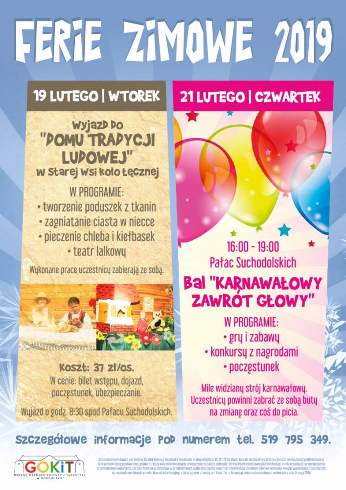 Prezentujemy program zajęć dla dzieci organizowanych przez Gminny Ośrodek Kultury i Turystyki przy współpracy z Gminną Biblioteką Publiczną, GKS Granica Dorohusk oraz Koło PZW Dorohusk w okresie Ferii Zimowych od 11 do 22 lutego 2019 r. w Pałacu Suchodolskich.