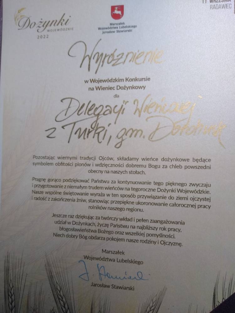 Z wyróżnieniem za wieniec dożynkowy wróciły Panie z Koła Gospodyń Wiejskich w Turce z Dożynek Wojewódzkich, które odbyły się w minioną niedzielę, 11 września w Radawcu.