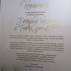 Komisja po obejrzeniu i ocenie 29 wieńców postanowiła przyznać jedno z czterech wyróżnień w kategorii wieniec tradycyjny KGW w Turce.