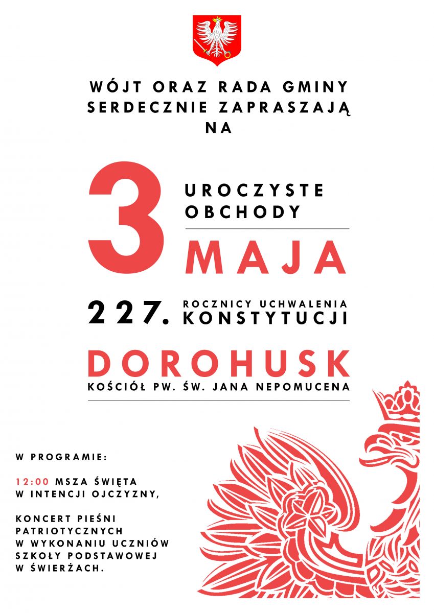 3 maja 2018 r. w Dorohusku odbyły się gminne uroczystości 227. rocznicy uchwalenia Konstytucji 3 Maja. Mszę Świętą w intencji ojczyzny odprawił ks. prałat Ryszard Winiarski - proboszcz parafii Dorohusk pw. św. Jana Nepomucena.