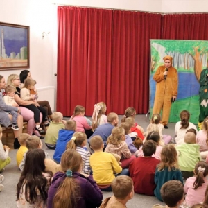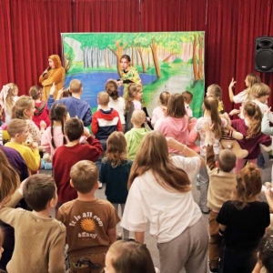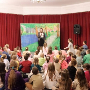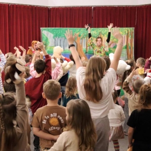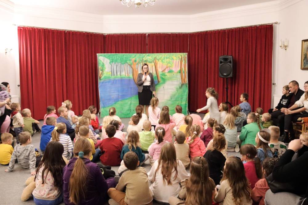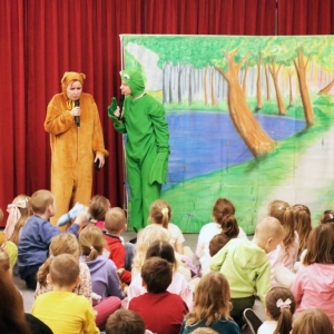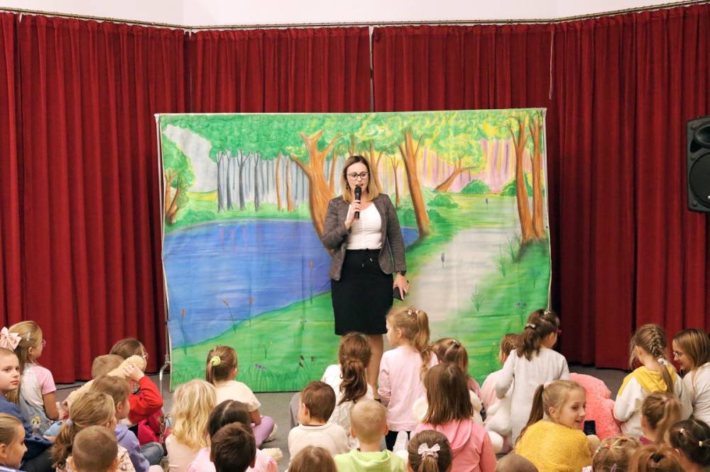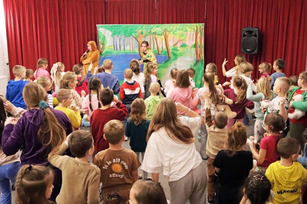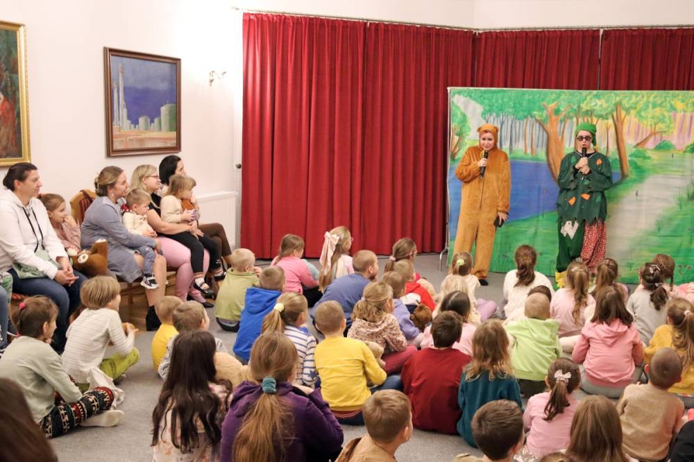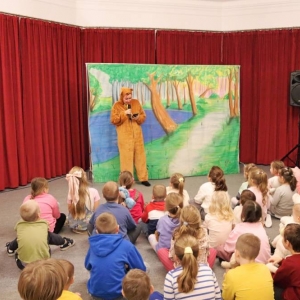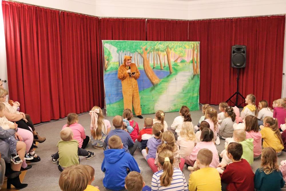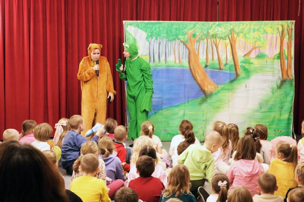 Na początek mali uczestnicy obejrzeli pełne humoru i wartości edukacyjnych przedstawienie teatralne pt. „Miś marzy skrycie o przyjacielu celebrycie” w wykonaniu Teatru Edukacji i Profilaktyki MASKA.