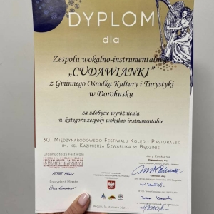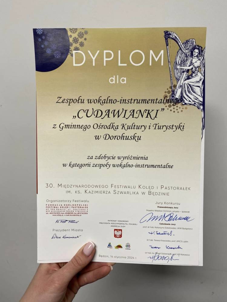 Reprezentujący Gminny Ośrodek Kultury i Turystyki w Dorohusku oraz Województwo Lubelskie zespół CudaWianki zdobył wyróżnienie na 30. Międzynarodowym Festiwalu Kolęd i Pastorałek im. Ks. Kazimierza Szwarlika w Będzinie.