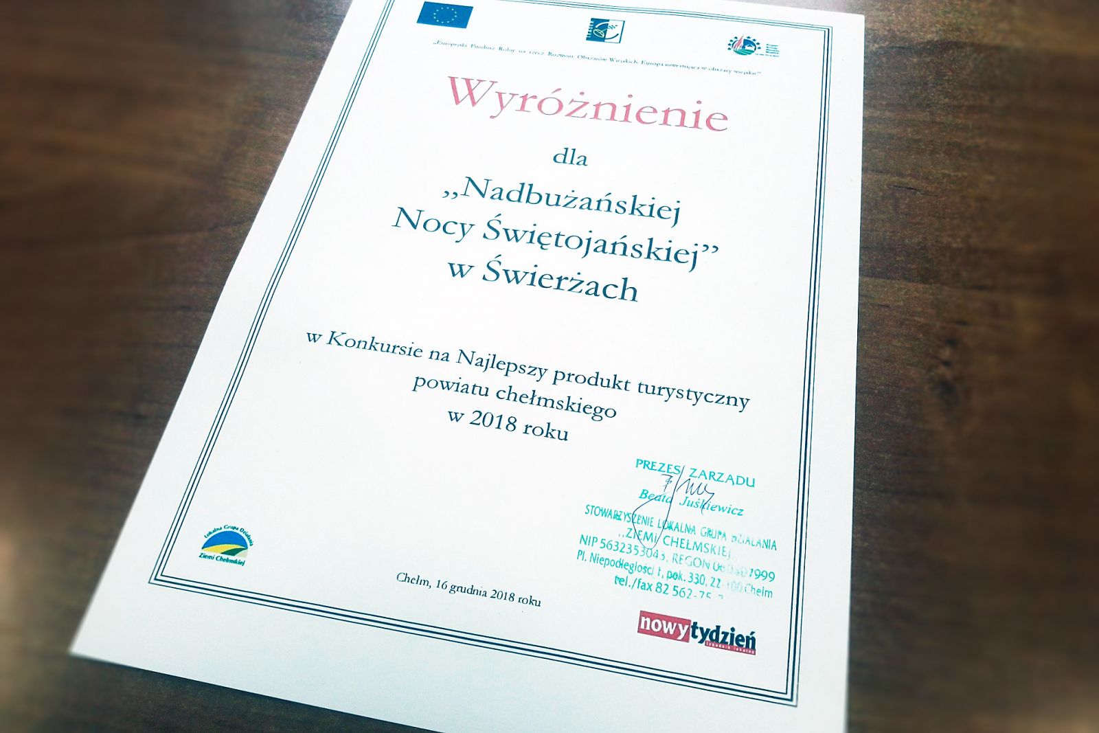Nadbużańska Noc Świętojańska w Świerżach otrzymała wyróżnienie w konkursie na „Najlepszy produkt turystyczny” Powiatu Chełmskiego w 2018 roku.