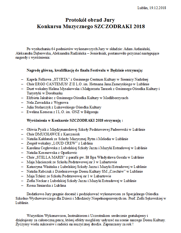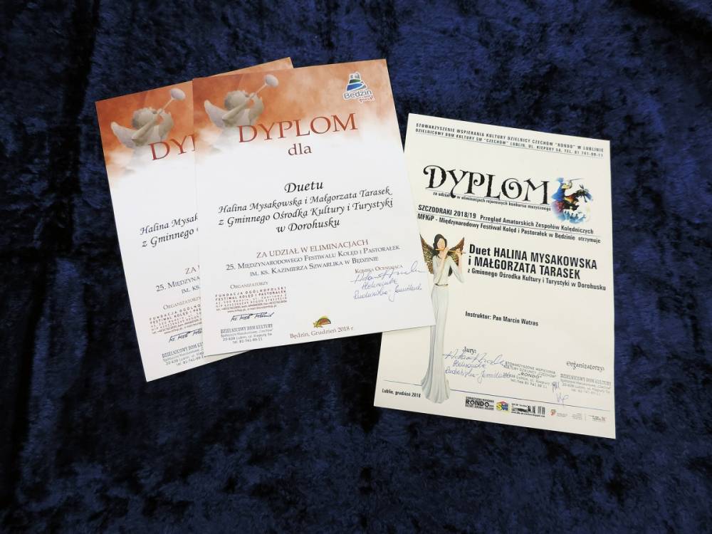 Niezmiernie miło nam poinformować, że duet wokalny - Halina Mysakowska i Małgorzata Tarasek reprezentujący Gminny Ośrodek Kultury i Turystyki w Dorohusku zdobywając nagrodę główną w eliminacjach Konkursu Muzycznego Szczodraki 2018 w Lublinie, dnia 17 grudnia 2018 r. zakwalifikował się do Międzynarodowego Festiwalu Kolęd i Pastorałek im. ks. Kazimierza Szwarlika, który odbędzie się w dniach 11-13 stycznia 2019 r. w Będzinie.