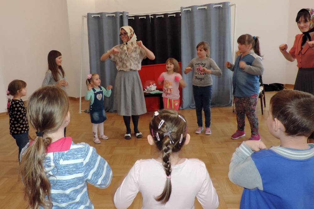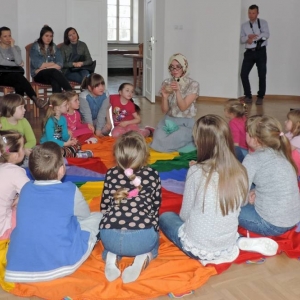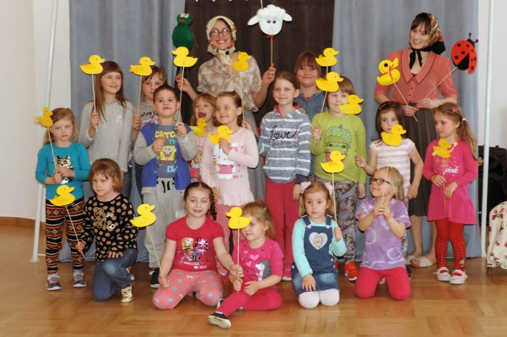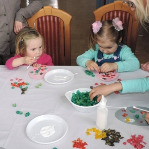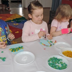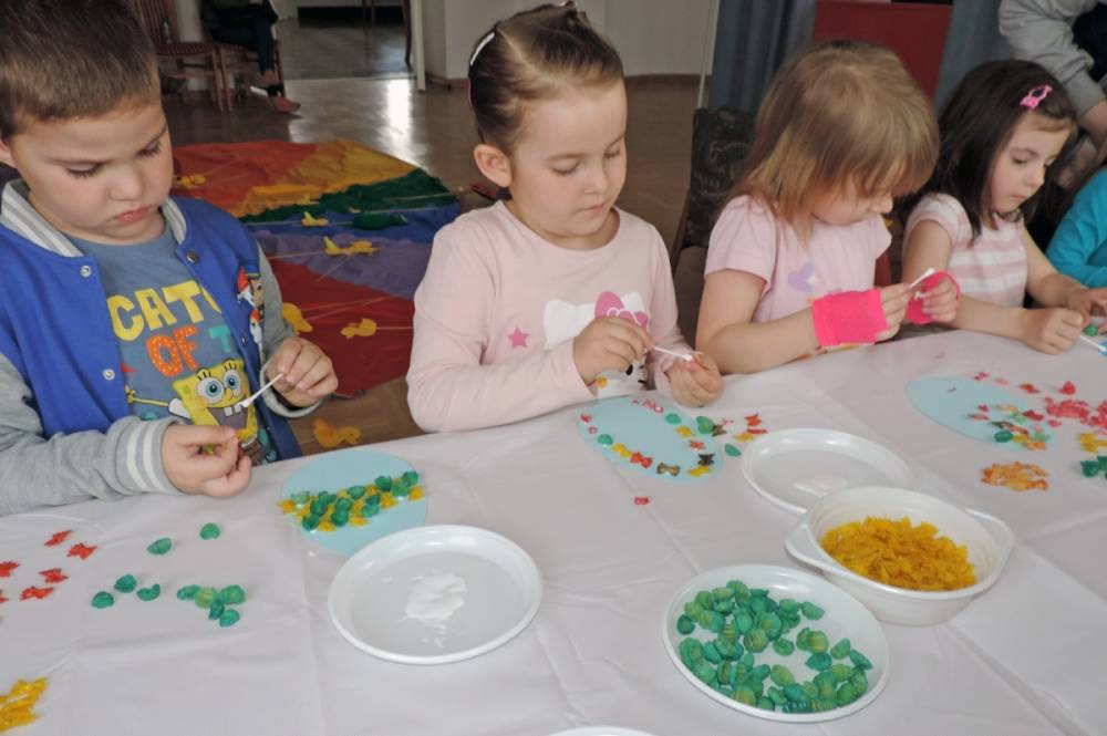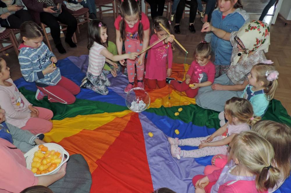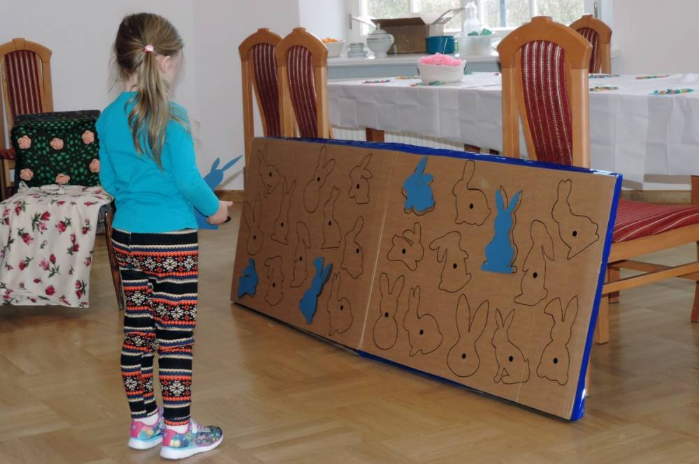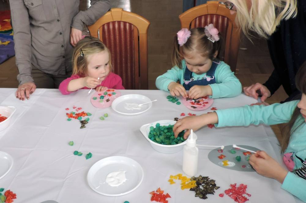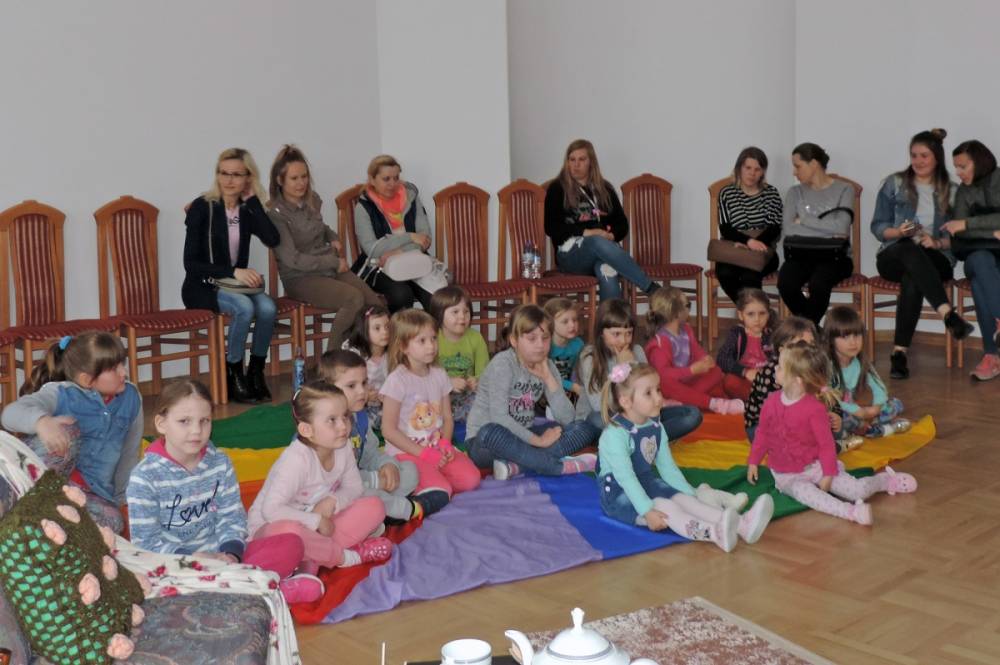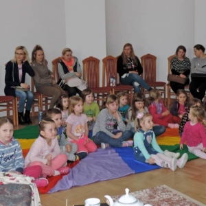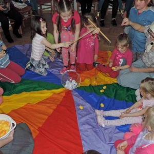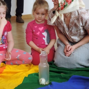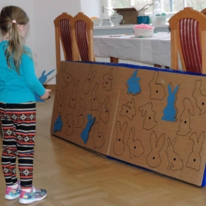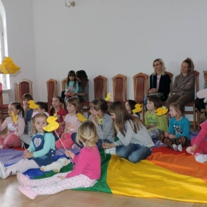 Spotkanie rozpoczęło się teatrzykiem kukiełkowym, w którym aktywnie uczestniczyły wszystkie dzieci. Nie zabrakło również eksperymentów i zagadek z "jajami". Najmłodsi mieli okazję ozdabiać ten wielkanocny symbol kolorowym makaronem. Nie mniejszym powodzeniem cieszyła się zabawa w dopasowywanie cieni królików. Spotkanie zakończyło się wspólnym tańcem.