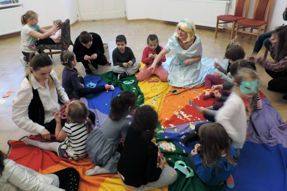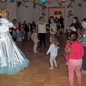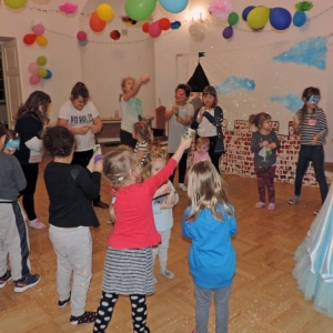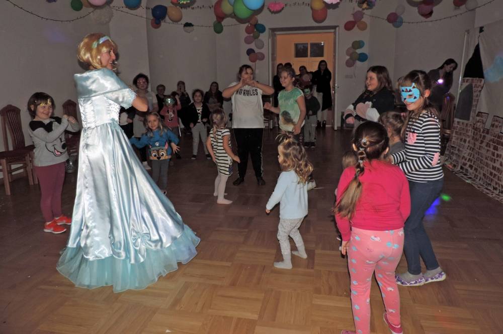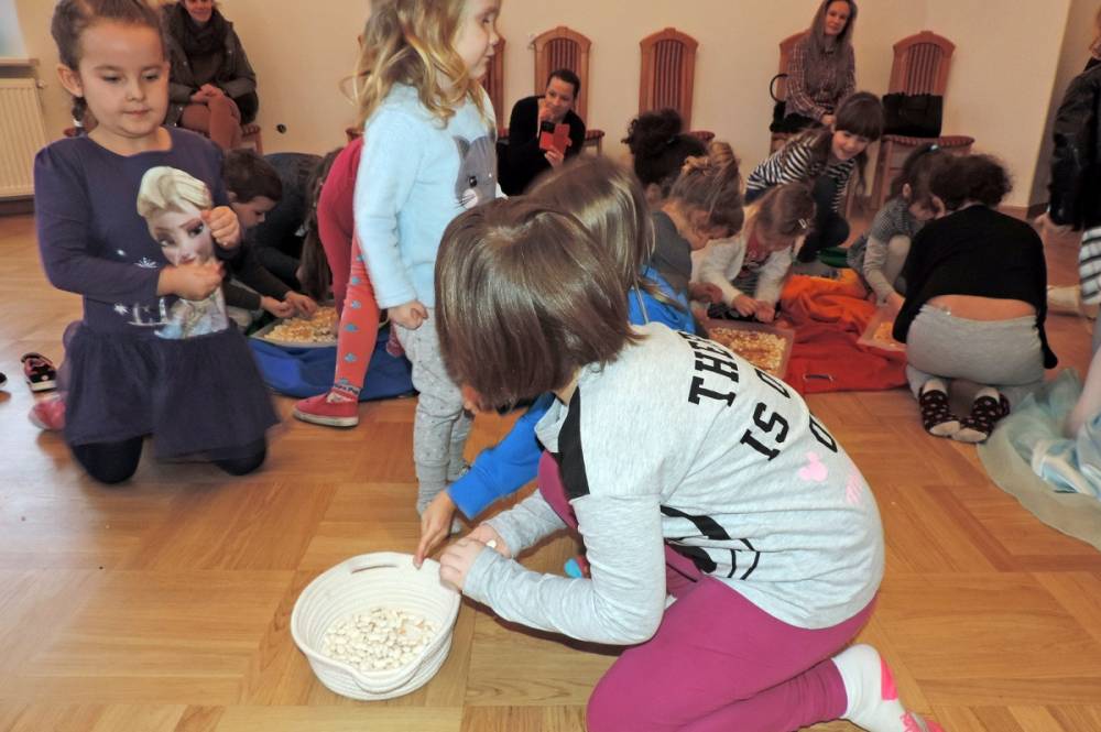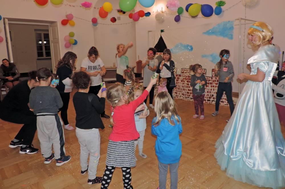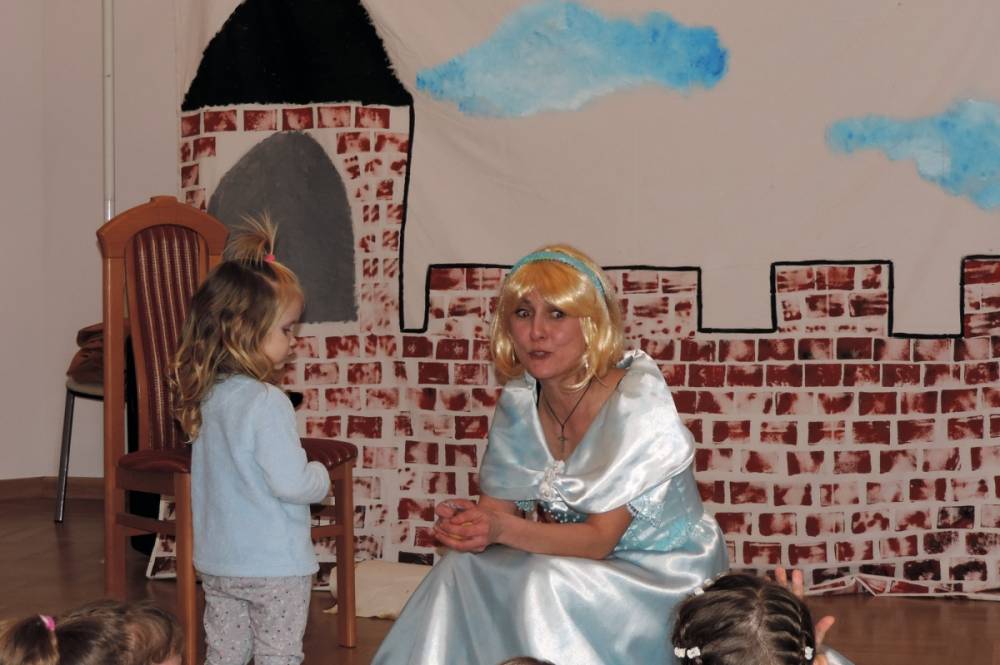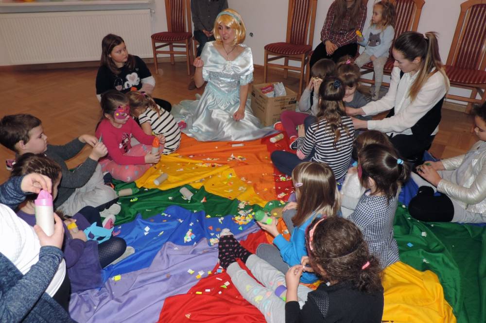 Spotkanie rozpoczęło się przybliżeniem historii bohaterki, następnie dzieci przymierzały zagubiony pantofelek i szukały właścicielki buta. Wśród zadań do wykonania było także oddzielanie fasoli od grochu, robienie masek i wyrzutni konfetti. Dzieci zbudowały także wieżę z patyczków, w której została uwięziona nasza bohaterka. Spotkanie zakończyło się wspólnym tańcem i wystrzeleniem konfetti.