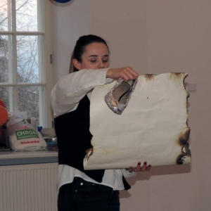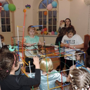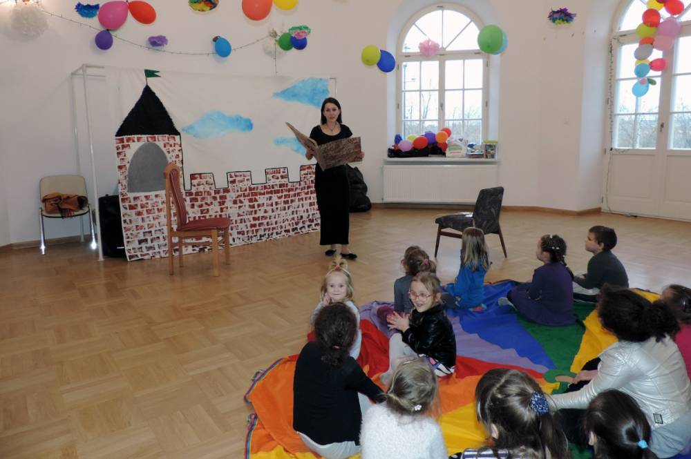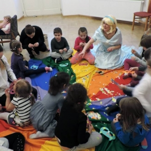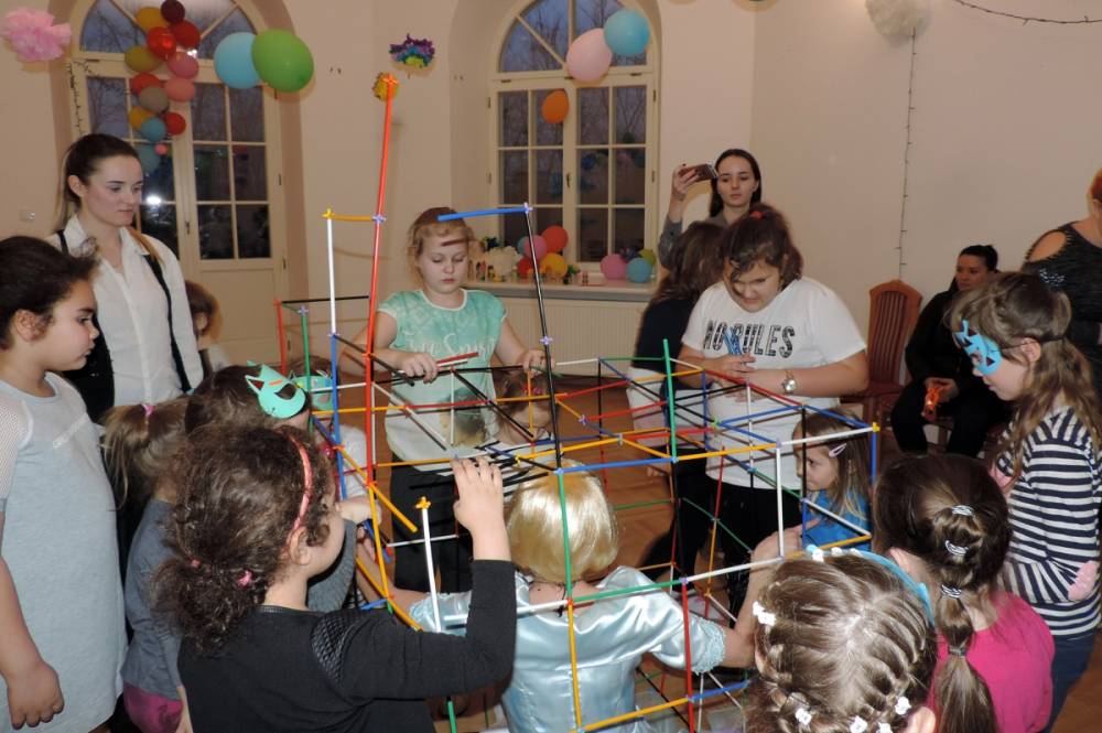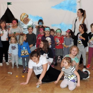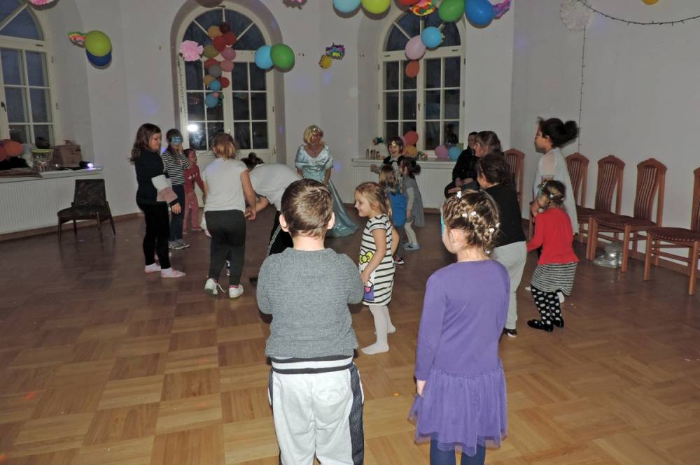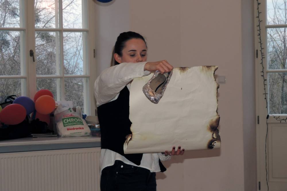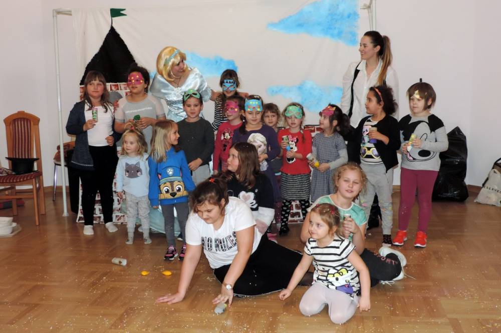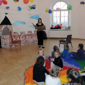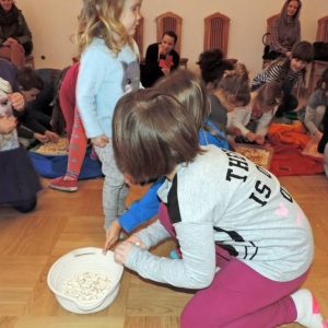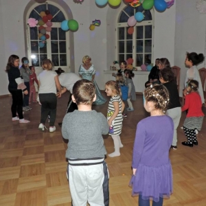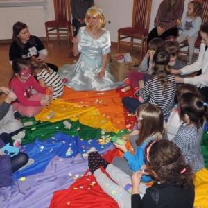 Spotkanie rozpoczęło się przybliżeniem historii bohaterki, następnie dzieci przymierzały zagubiony pantofelek i szukały właścicielki buta. Wśród zadań do wykonania było także oddzielanie fasoli od grochu, robienie masek i wyrzutni konfetti. Dzieci zbudowały także wieżę z patyczków, w której została uwięziona nasza bohaterka. Spotkanie zakończyło się wspólnym tańcem i wystrzeleniem konfetti.