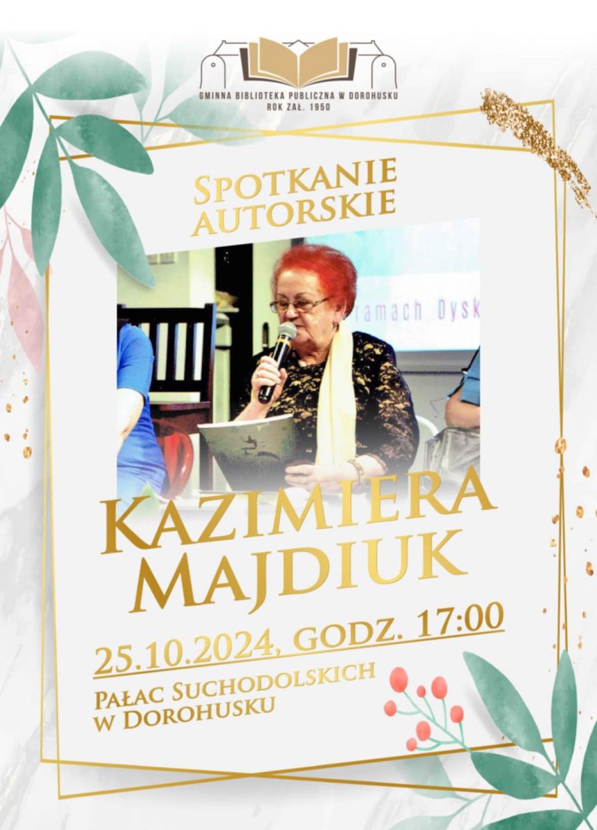 Dnia 25 października 2024 roku w przepięknych wnętrzach Pałacu Suchodolskich w Dorohusku odbyło się spotkanie autorskie z lokalną poetką Kazimierą Majdiuk z Okop. Organizatorem spotkania była Gminna Biblioteka Publiczna w Dorohusku. Bohaterka spotkania przez 40 lat pracowała w Szkole...
