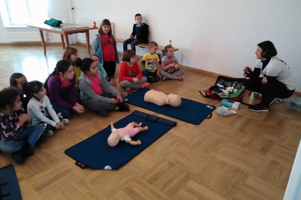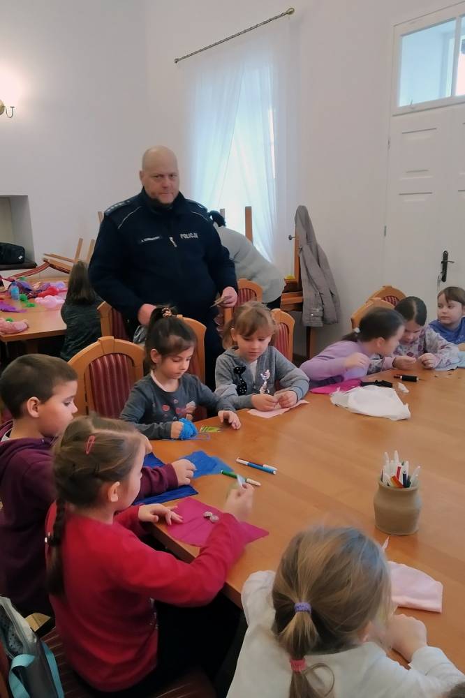 Dzieci uczył się także udzielania pierwszej pomocy i spotkały się asp. szt. Arturem Dzieńkowskim, który opowiedział o bezpieczeństwie na drodze i rozdał wszystkim odblaski.