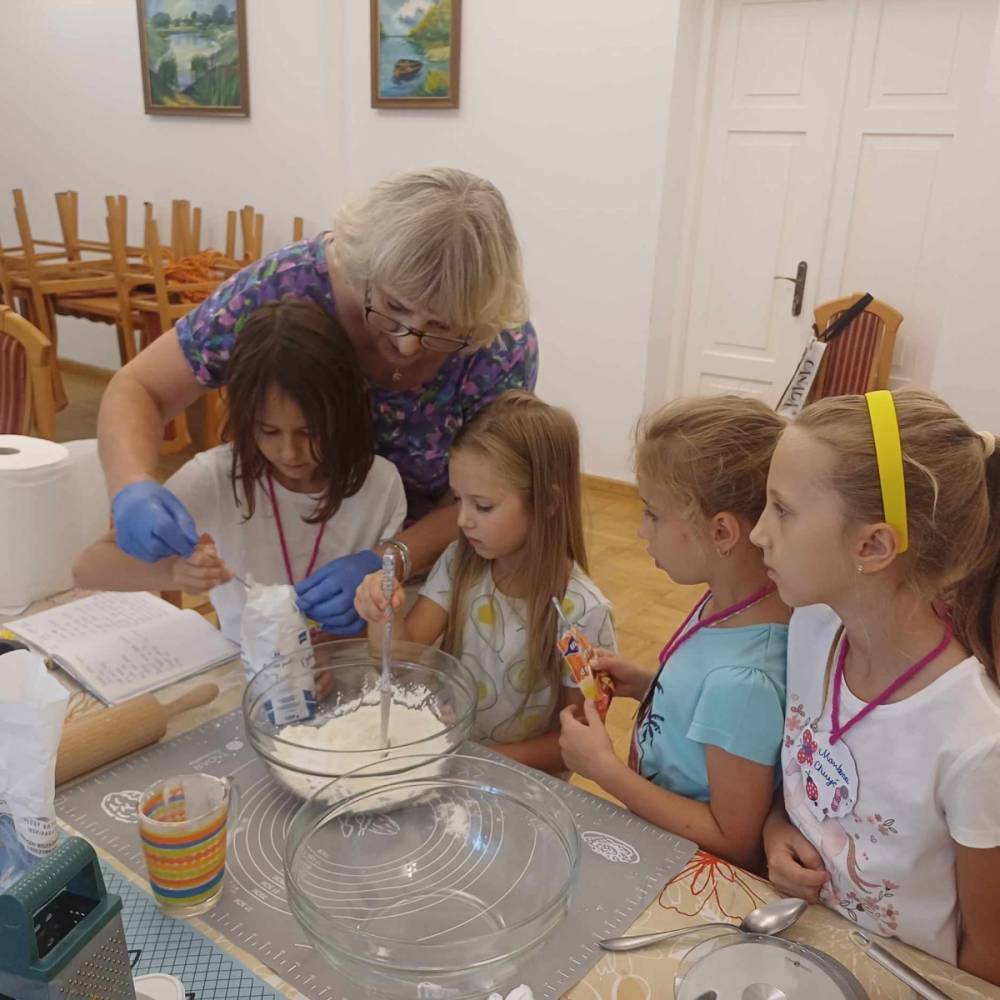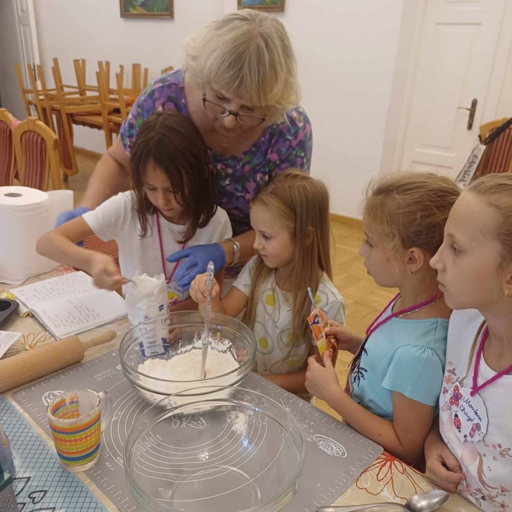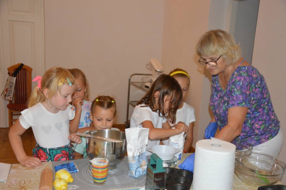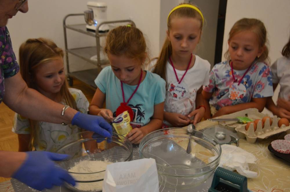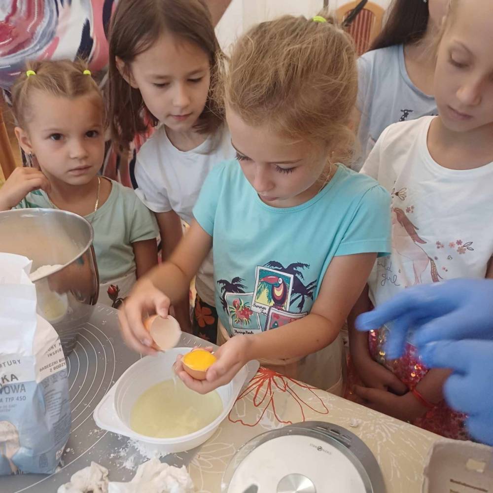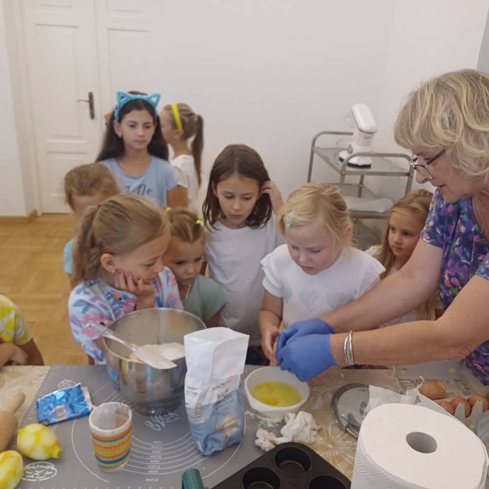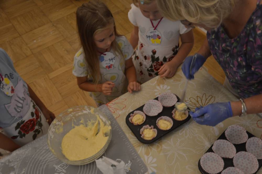 Pierwszego dnia „Wakacji z Biblioteką 2024” odbyły się warsztaty kulinarne. Na zajęciach robiono kruche ciasteczka i mufinki. Mali uczestnicy warsztatów pod okiem Pani Wandy wałkowali ciasto, a następnie wycinali je foremkami. Serduszka, jeżyki, zajączki, listki i inne kształty trafiały na blaszkę i do piekarnika. Dzieci mogły skosztować swoich wypieków tuż po ich upieczeniu, ale także poczęstować nimi domowników po powrocie do domu. Powstawały również przepiękne budowle z klocków.