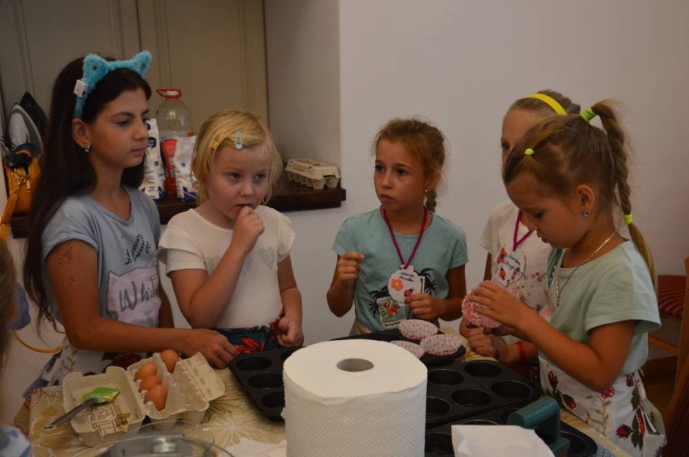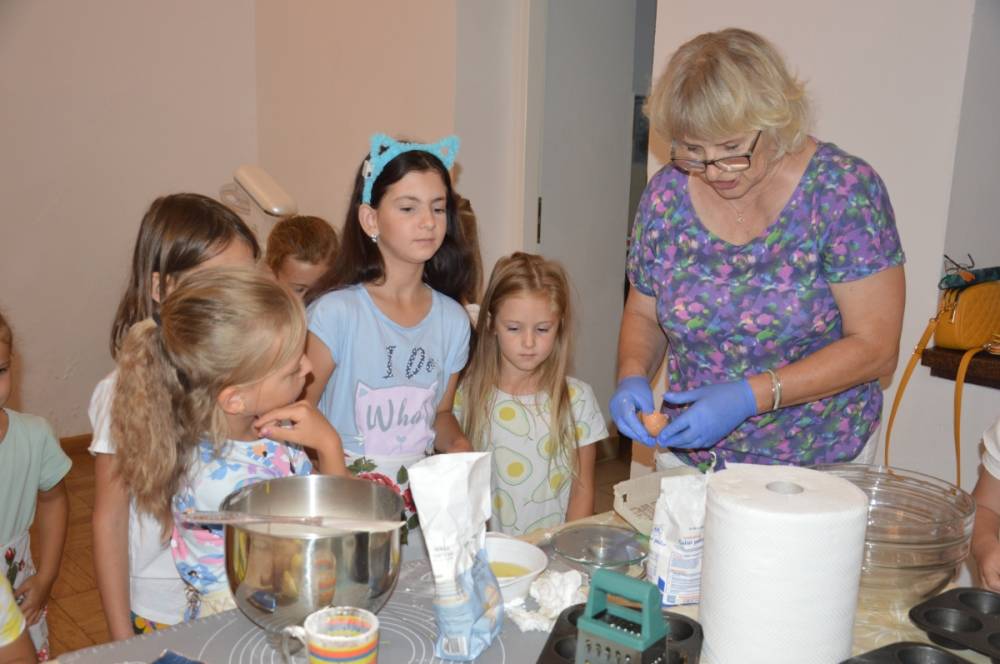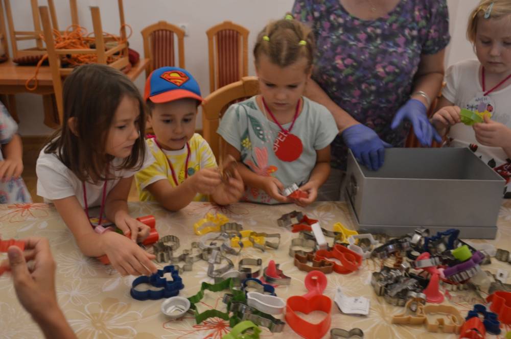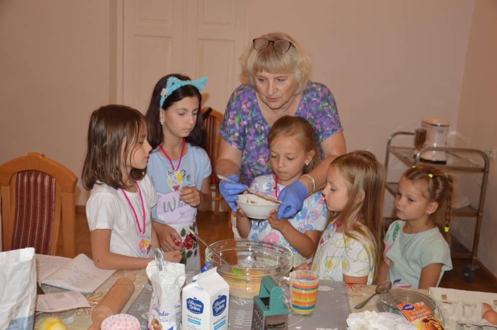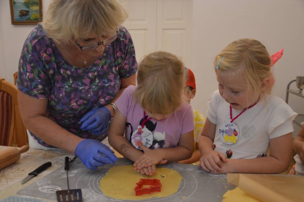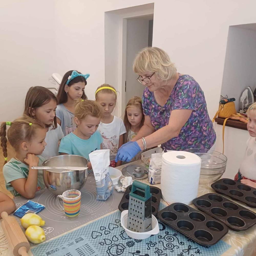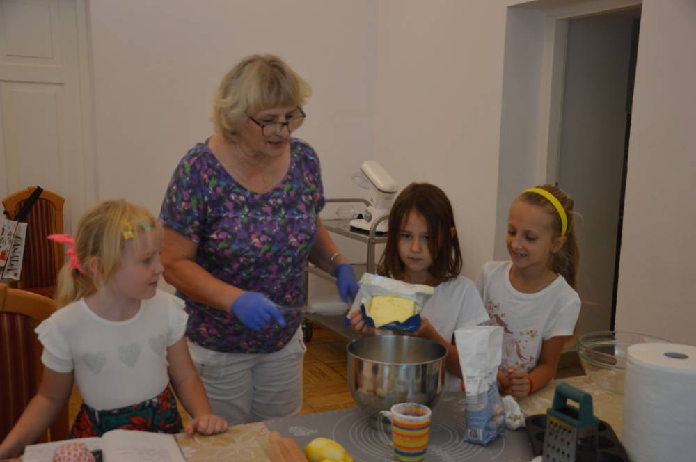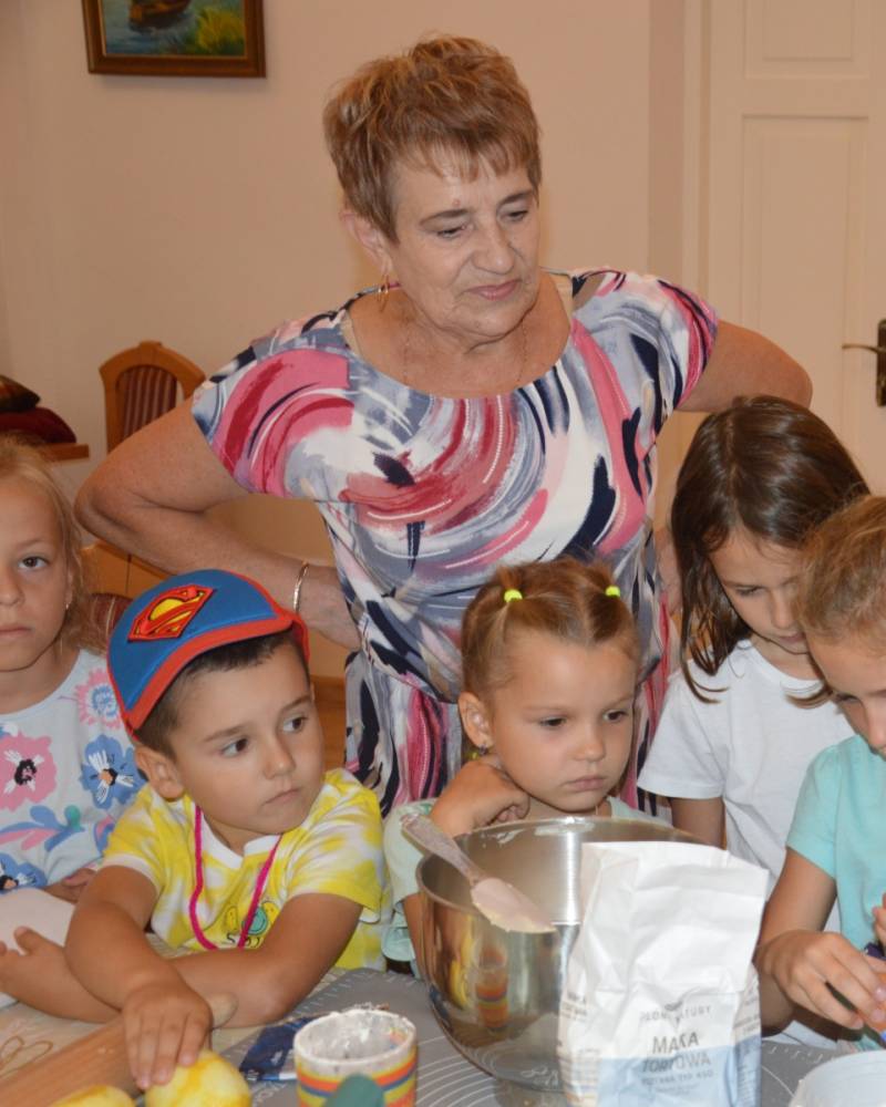Pierwszego dnia „Wakacji z Biblioteką 2024” odbyły się warsztaty kulinarne. Na zajęciach robiono kruche ciasteczka i mufinki. Mali uczestnicy warsztatów pod okiem Pani Wandy wałkowali ciasto, a następnie wycinali je foremkami. Serduszka, jeżyki, zajączki, listki i inne kształty trafiały na blaszkę i do piekarnika. Dzieci mogły skosztować swoich wypieków tuż po ich upieczeniu, ale także poczęstować nimi domowników po powrocie do domu. Powstawały również przepiękne budowle z klocków.